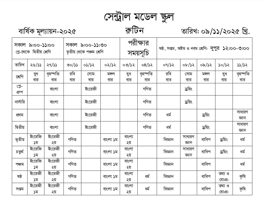 It is hereby informed to all students and guardians of Central Model School, Sylhet that the Annual Examination Routine 2025 has been published on the school’s official website.